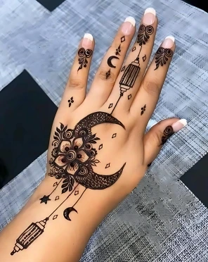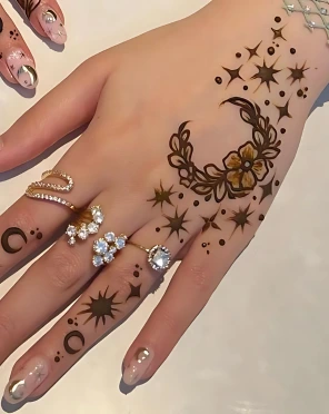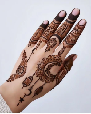 This beautiful dream catcher mehndi is the perfect choice! Featuring an elegant circular pattern on the back of the hand, detailed finger designs, and delicate chain-like elements…